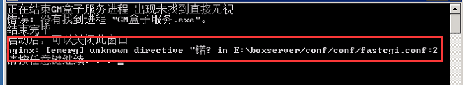 架设盒子与会员站时出现的问题解答 问题解答 启动BOX服务时提示0.0.0.0:80 failed <10013的报错提示,说明服务器IIS中占用了80端口 打开IIS,将IIS里所占用的80端口关闭,如果IIS中没有架设游戏网站或其他网站占用的80端口,那么只需要关闭或右键删除Default Web Site即可    启动BOX服务时,有一段报错提示乱码与路径,看下图:  这个问题实则是fastcgi.conf文件你没有用N++打开导致的文件编码不对所引起,遇到这个问题在服务器中安装N++后用这个文本编辑器打开fastcgi.conf文件更改一下文件编码然后保存即可 更改方法:点击N++顶部菜单的编码功能,选择第二个的 使用 UTF-8 编码,然后保存   最后重新双击启动BOX服务启动服务