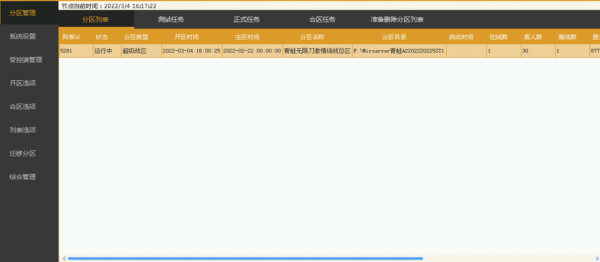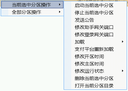 ## 分区管理   ## 分区列表 ## 右键功能 1、当前选中分区操作(右键修改单个分区信息与加载版本NPC、脚本等功能) 2、全部分区操作(右键修改全部分区信息与加载版本NPC、脚本等功能) 测试任务与正式任务 1、所有分区的测试开区任务时间 2、所有分区的正式开区任务时间 准备删除分区列表 1、助手准备删除的分区列表以及分区文件