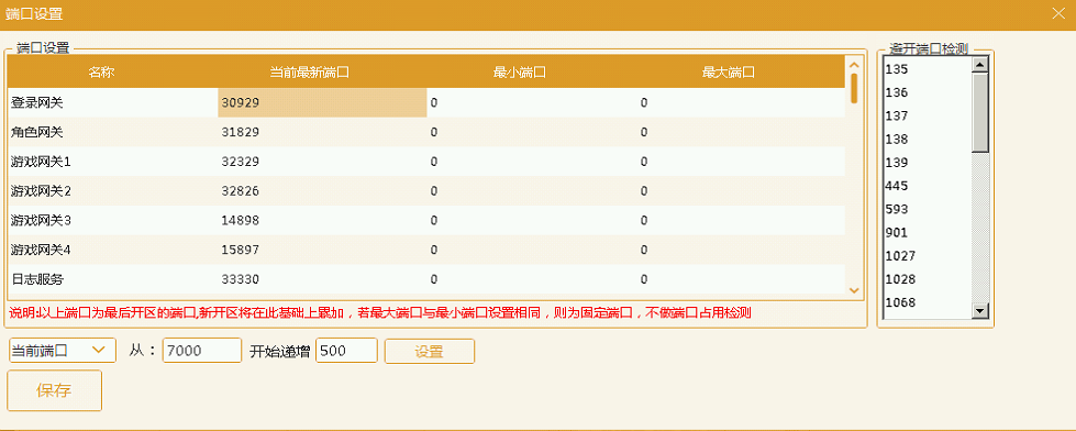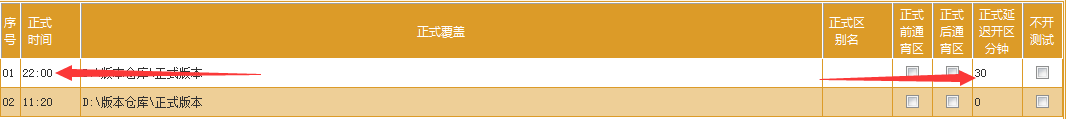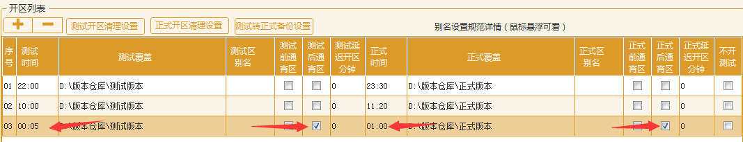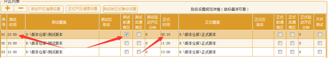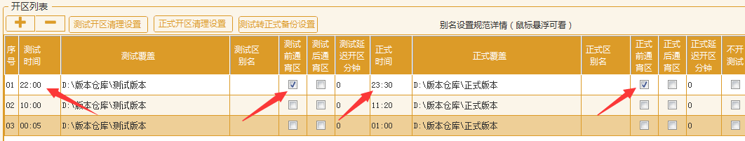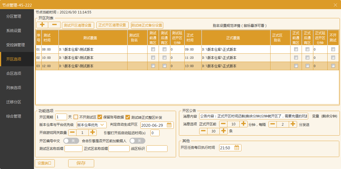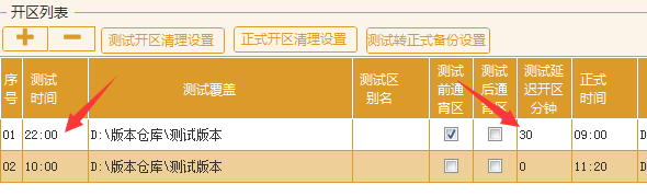 # 开区选项  #### 一、《开区列表》 《设置截图》  1、开区选项中点击加号添加开区数量(每天开多少个区就添加多少个区,例:每天6个区,那么就点击加号添加6个) 2、序号(即代表分区编号,例:01区、02区、03区等,最大支持每日99个区) 3、测试时间(设置每个新区的测试开区时间) 4、正式时间(设置每个新区的正式开区时间) 5、测试区别名(测试区别名可自定义设置也可根据版本沙捐脚本中检测而设定,例:通宵,而第二个区可设定为01区) 6、正式区别名(正式区别名可自定义设置也可根据版本沙捐脚本中检测而设定,例:通宵,而第二个区可设定为01区) 7、测试前通宵区(说明:如测试时间未超过00:00点则需要勾选此功能项) 如实例  8、测试后通宵区(说明:如后几个测试开区时间超过00:00点则需要勾选此功能项) 如出现测试后通宵区,必然对应区的正式区也会是后通宵区 如实例  9、正式前通宵区(说明:正式开区时间如果未超过00:00则需要勾选此功能项) 如实例  10、正式后通宵区(此功能代表最后几个正式开区时间如果超过00:00需要勾选) 如实例  11、测试覆盖(开测试区时需要覆盖版本中的一些空文本数据,单个版本时可默认也可自定义覆盖文件名,注:覆盖中的路径一定要与版本中的路径一致并且记住不是压缩包的形式)  12、正式覆盖(开正式区时需要覆盖版本中的一些空文本数据,单个版本时可默认也可自定义覆盖文件名,注:覆盖中的路径一定要与版本中的路径一致并且记住不是压缩包的形式)  13、测试延迟开区分钟(提前多少时间将当前分区列表格式显示到登录器中与定时特殊任务配合) 说明:如测试开区时间为22:30,想要提前半小时就将列表格式显示到登录器中,那么测试时间则更改为 22:00,测试延迟开区分钟则填写30,而后定时特殊任务中的间隔分钟填写1,再勾选上传延迟分区列表即可   14、正式延迟开区分钟(提前多少时间将当前分区列表格式显示到登录器中与定时特殊任务配合) 说明:如正式开区时间为22:30,想要提前半小时就将列表格式显示到登录器中,那么正式时间则更改为 22:00,正式延迟开区分钟则填写30,而后定时特殊任务中的间隔分钟填写1,再勾选上传延迟分区列表即可   15、测试开区清理设置(本功能一般无需设置) 16、正式开区清理设置(如果版本中一个数据文件夹内会自动生成一些文本数据可在此功能内设置清理路径,格式为:Mir200\Envir\QuestDiary\XXXX,否则无需设置). 17、测试转正式备份数据(备份保存路径为磁盘的绝对路径,备份填写与合区合并文本的模式一样,带有后缀的就是单独文件,不带后缀的就是文件夹,注:必须以Mir200或\开头)  18、不开测试(第一个区或最后一个区又或者其中一个区勾选此功能项后则代表着只开正式区,而未勾选此功能项的继续正常开测试与正式)  #### 二、《功能选项》 1、开区周期(默认为1的代表每天都开区,如果是两天一开区,那么就将周期1改为2然后配合周期计算开始日期使用) 与周期开始日期呼应,判定自动生成开区任务的标准: (目标任务日期-周期计算开始日期)整除开区周期数后的余数=0即为此目标日期会有任务出现   2、不开测试区(勾选后则表示每天直接开正式区而不开测试区)  3、保留账号数据(勾选后表示测试转正式后保留玩家账号数据)  4、测试转正式整区补发(勾选后测试转正式区时自动整区补发测试区时玩家的平台充值,不勾选即代表不补发)  5、 版本仓库与平台优先级(默认即可,无需更改)  6、开启游戏网关数量(默认即可,如需要增加GOM游戏网关数量,如更改为2则开启2个游戏网关,GEE引擎游戏网关数量如不开多线程模式,数量更改为4时即为开启2个游戏网关)  7、引擎打开后启动延迟时间S(此功能代表助手打开引擎控制台后延迟多少秒启动,如无需要默认即可,主要对应于风云盾类型封挂功能,它需要在引擎启动前打开引擎控制器等待3-15秒左右才能启动引擎)  8、开区编号中文(默认分区编号是01区、02区、03区等,开启后分区编号将会是一区、二区、三区以此类推)  9、合击引擎开区前是否加载假人(除老型的LEG合击引擎等外此功能不需要开启)  10、测试区游戏名称后缀(意思是代表测试开区后引擎控制台上服务器名中的后缀,例:填写测试,那么控制台上服务器名<$servername>中会显示小浪人助手XX号01区测试)  11、正式区游戏名称后缀(意思是代表正式开区后引擎控制台上服务器名中的后缀,例:填写正式,那么控制台上服务器名<$servername>中会显示小浪人助手XX号01区正式,默认留空即可)  12、战区标识(真正意义上的季度战区等方式截断,并且列表格式中填写{战区标识}变量让列表也可以分化明显的季度分区,输入框内可填写例:第一季度、第二季度或一阶段、二阶段等)   #### 三、《开区公告》 1、消息内容(测试转正式之前发送开区消息,如非必要无需更改内容默认即可)  2、消息选项(正式区开区前的多少分钟游戏内开始发送公告提醒玩家,每隔多少分钟重复发送公告,默认公告条数为30条,公告条数可自行更改)  #### 四、《其他》 1、开区任务每日执行时间(助手每日自动生成次日开区任务的时间,时间不得超过00:00,也不得超过第一个区的开区时间,可默认)  设置端口(如果同一个服务器中只开一个版本,那么本功能的端口无需做任何更改,如同一个服务器中开了2个版本,那么在第二个节点中需要更改本功能中的端口,端口更改可