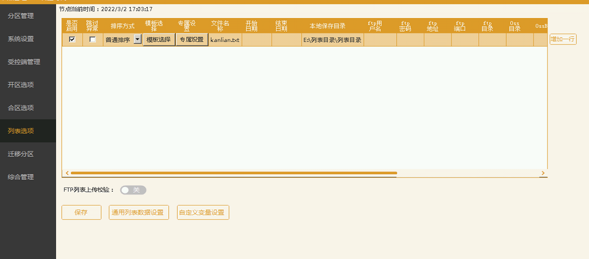 ## 列表设置 #### 功能截图  1. 列表默认为空需要手动增加 2、点击右侧增加一行按钮添加列表配置项 3、是否启用(勾选后即为使用此列表,反之为不启用) 4、异常跳过(勾选后即代表助手在上传列表时遇到出错后直接跳过上传列表,反之则为不启用,一般默认为不勾选) 5、模板选择(默认为选择全部模板,如果不想要某个分区列表格式显示到登录器上,双击已选择模板其中一个到未选择模板中即可,注:如非必要请不要做任何更改)  6、专属设置(此功能为列表格式模板,在拥有云传奇列表时可在专属设置中设置云传奇列表格式,另外当用到天天新区显示列表格式而又不想让每个登录器上的列表格式都一样可在每个专属设置中添加不一样的列表格式) 7、文件名称(即代表登录器读取的列表格式名) 8、开始日期(此为列表截断功能,日期格式为:XXXX-XX-XX或XXXX/XX/XX) 9、结束日期(此为列表截断功能,日期格式为:XXXX-XX-XX或XXXX/XX/XX) 10、本地保存目录(代表列表格式在本地服务器上传存储目录路径) 11、FTP用户名(FTP工具或挂站空间的FTP账号,注:德迅和快快服务器不可用FTP上传,否则出现会导致FTP端口被封上传列表出错) 12、FTP密码(FTP工具或挂站空间的FTP密码,注:德迅和快快服务器不可用FTP上传,否则出现会导致FTP端口被封上传列表出错) 13、FTP地址(意思是服务器的IP或挂站空间的FTP地址) 14、FTP端口(挂站空间给的FTP端口默认都是21,除非端口做过更改,服务器中FTP工具上设定的FTP端口) 15、FTP目录(如需要二级目录,则填写‘/二级目录/’,一定要记住如FTP指向目录就是列表所在目录,不需要填写内容) 16、OSS目录(即为阿里云,腾讯云等OSS的名称作为目录,直接设定名称即可,不需要添加任何符号) 17、OSS的Name、Point、KEY、ID都可在OSS管理后台获取 18、FTP列表上传校验(默认为关闭状态,一般不需要开启) 19、通用列表数据设置(单个登录器读取列表格式时可直接在此设置列表格式) 二、《自定义变量设置》 1、点击右侧添加按钮添加行 2、自定义参数(此参数可自定义变量项,例:{分区爆率}、{分区序号}等) 3、分区类型(分区类型即代表自定义变量要在哪个分区列表格式中显示) 4、分区序号(分区类型中选择测试区或正式区时,分区序号为1即代表在01区列表格式中显示,为2时代表在02区列表格式中显示) 5、自定义内容(比如:1.1倍爆率、1.2倍爆率、一区、二区或正式区的开区时间00:00,这样就可以在每个分区列表格式中显示不同的自定义内容) 6、(列表格式中我们官方代理给你配置的使用最多的列表变量是{最新日期}、{日期}、{主区日期}、{尾区日期}、{分区名称}、{分区端口}、{微端地址}、{微端端口},剩余的列表变量请自行搭配) 7、列表分区编号默认显示格式(测试区和正式区:XX号XX区,首沙区:XX号区,两天区四天区:XX号-XX号区,统战区:第一统战区、第二统战区,总战区:第一总站区、第二总战区,超级战区:第一超级战区,特殊情况下测试区别名与正式区别名设置名称为A组01区、A组02区等,那么列表格式中就会以XX号A组01区,合区选项中加了合区后缀,那么列表格式中显示方式就直接是XX号,修改列表格式时先以分区编号显示格式将列表对齐再更改为变量) 8、列表格式中的自定义区域1 2 3 4(可加入自己想要的内容在其中,并且模板设置中自行进行排序,例:以下或以上为某月某日区,注:自定义区域列表仅支持最新日期、最新月份、分区名称、战区标识、列表自定义变量) 三、《列表格式说明模板例子》 1、测试区 ①:250,0=小浪人智能助手{最新日期}号新区|浪人助手{分区编号}|{分区名称}{分区编号}|{分区地址}|{分区端口}|1|{微端地址}|{微端端口}|0 ②:250,0=小浪人智能助手15号新区|浪人助手15号01区|{分区名称}{分区编号}|{分区地址}|{分区端口}|1|{微端地址}|{微端端口}|0 2、正式区 ①:250,0=小浪人智能助手{日期}号新区|浪人助手{分区编号}|{分区名称}{分区编号}|{分区地址}|{分区端口}|1|{微端地址}|{微端端口}|0 ②:250,0=小浪人智能助手15号新区|浪人助手15号01区|{分区名称}{分区编号}|{分区地址}|{分区端口}|1|{微端地址}|{微端端口}|0 3、首沙区 ①:250,0=小浪人智能助手{主区日期}号新区|浪人助手{分区编号}|{分区名称}{分区编号}|{分区地址}|{分区端口}|1|{微端地址}|{微端端口}|0 ②:250,0=小浪人智能助手15号新区|浪人助手15号区|{分区名称}{分区编号}|{分区地址}|{分区端口}|1|{微端地址}|{微端端口}|0 4、两天区 ①:250,0=小浪人智能助手{主区日期}号-{尾区日期}号区|浪人助手{分区编号}|{分区名称}{分区编号}|{分区地址}|{分区端口}|1|{微端地址}|{微端端口}|0 ②:250,0=小浪人智能助手15号-16号区|浪人助手15号-16号区|{分区名称}{分区编号}|{分区地址}|{分区端口}|1|{微端地址}|{微端端口}|0 4、四天区 ①:250,0=小浪人智能助手{主区日期}号-{尾区日期}号区|浪人助手{分区编号}|{分区名称}{分区编号}|{分区地址}|{分区端口}|1|{微端地址}|{微端端口}|0 ②:250,0=小浪人智能助手15号-16号区|浪人助手15号-16号区|{分区名称}{分区编号}|{分区地址}|{分区端口}|1|{微端地址}|{微端端口}|0 统战区 ①:250,0=小浪人智能助手{主区日期}号-{尾区日期}号区|浪人助手{分区编号}|{分区名称}{分区编号}|{分区地址}|{分区端口}|1|{微端地址}|{微端端口}|0 ②:250,0=小浪人智能助手15号-16号区|浪人助手第一统战区|{分区名称}{分区编号}|{分区地址}|{分区端口}
