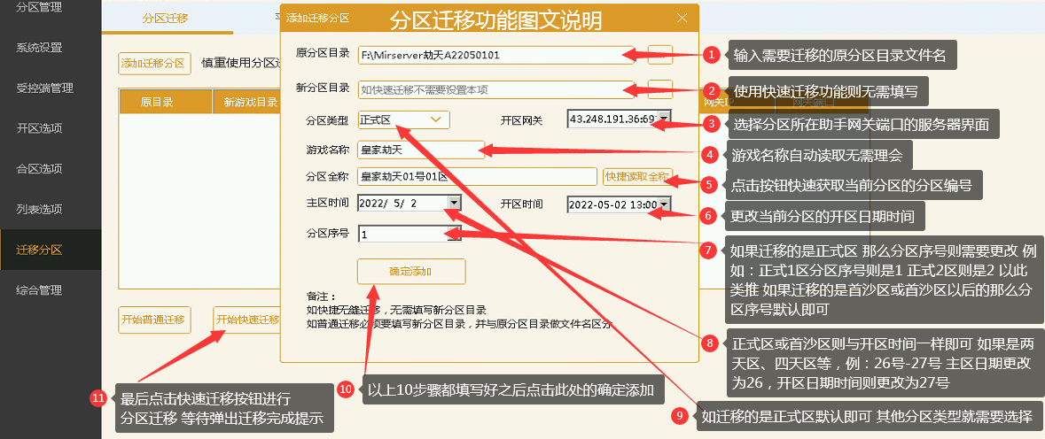 ## 分区迁移  1、原分区目录(输入需要迁移的原分区目录文件名) 2、新分区目录(使用快速迁移时无需填写次项) 3、开区网关(选择分区所在助手网关端口的服务器界面) 4、游戏名称(游戏名称自动读取助手系统设置中设置好的游戏名称) 5、分区全称(点击快捷读取全称按钮获取当前分区的分区全称) 6、开区时间(更改当前分区的开区日期时间 例如是当月的01号01区 即更改为当月的01号 时间则填写为你第一个区的开区时间) 7、分区序号(如迁移的是正式区则按照01区 02区 03区顺序来更改 01就代表序号1 02即代表序号2 以此类推 首沙区及以下分区序号则统一默认为1) 8、主区时间(正式区或首沙区则与开区日期时间相同即可 如果是两天区、四天区、统战区等 则以分区编号的首位编号为主 例:26号-27号区 则更改日期为26号) 9、分区类型(如果迁移的是正式区那么默认即可 如果迁移的是首沙区或者两天区又或者其他分区类型选择即可) 10、以上10个步骤都填写好以后点击确定添加按钮添加分区迁移任务 11、最后点击界面中的 快速快速迁移按钮 进行迁移 等待提示迁移完成即可