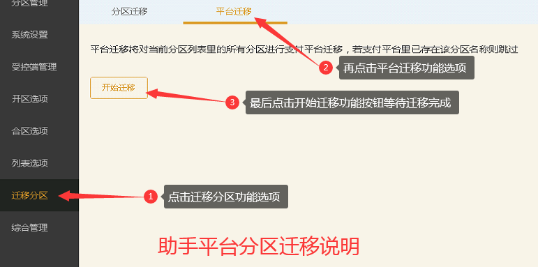 ## 平台迁移  以下情况可用到平台迁移功能 1、正在开区时平台设置中途新增加货币类型 2、测试转正式时后加的多送百分比比例可使用分区迁移 3、合区时提示无法查找到平台分区时使用 4、老服务器更换新服务器时使用平台迁移 5、更换平台时使用平台迁移功能一键迁移v