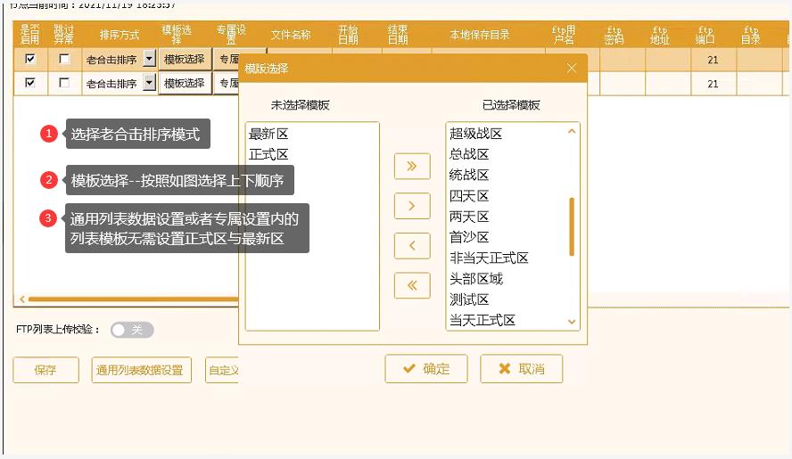 ## 合击引擎列表排序  1、选择老合击排序模式 2、模板选项—按照如图选择上下顺序 3、通用列表数据设置或专属设置内的列表模板无需设置正式区与最新区的列表格式 特别说明:建议合击引擎的列表格式中尽量不要带日期