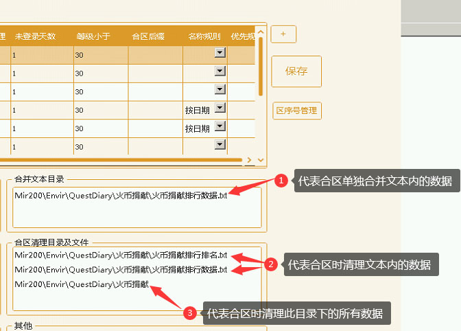 合区合并目录文本以及删除文本或目录  1、合并文本(代表合区单独合并文本内的数据) 2、合并目录(代表合区时合并整个目录下的数据) 3、合并文本路径格式以图中为例 4、合并目录路径格式:Mir200\Envir\QuestDiary\XXXX.txt 注:如需要版本根目录的其他文件夹下的文本需要合并,那就在路径前加‘/’ 例如 \RunGate\CheckLand\GK机器限制.txt \RunGate\CheckLand\角色名限制.txt 1、合区清理目录(代表合区时清空目录下的所有数据文件) 2、合区清理文本数据(代表合区时清理单独的文本中的数据内容) 3、路径格式以图中为例