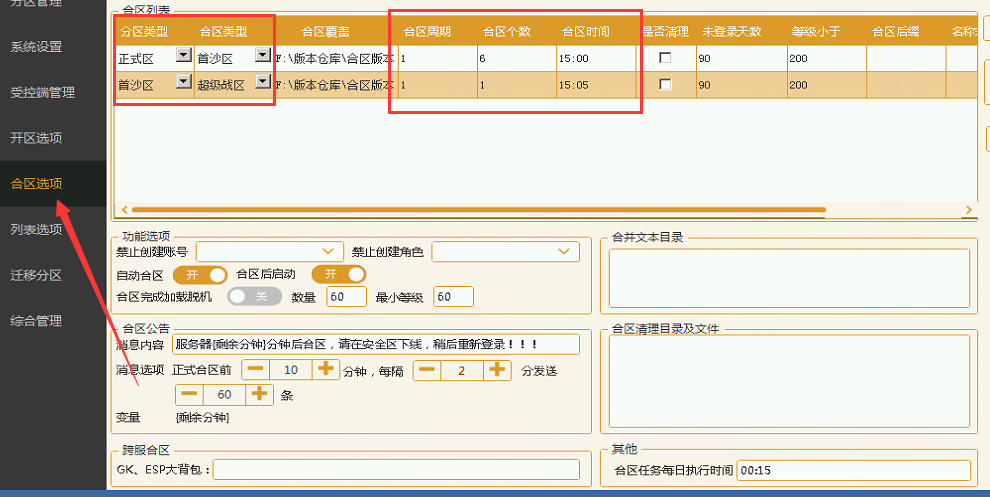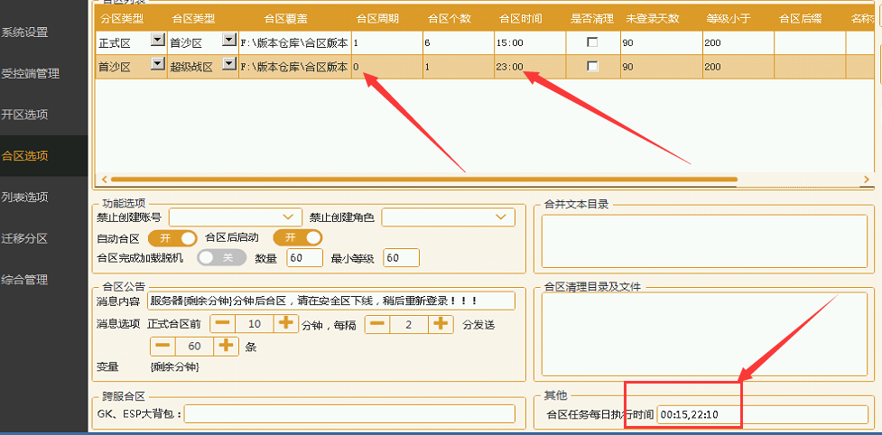 ## 拿完沙当天或隔天直接合老区 拿完沙第二天合老区  1、合区列表中右键删除四个合区模式 2、第二行分区类型选择首沙区,合区类型选择超级战区 3、合区周期默认1即可,合区个数也默认1,合区时间自定义 拿完沙当天晚上合老区  1、合区列表中右键删除四个合区模式 2、第二行分区类型选择首沙区,合区类型选择超级战区 3、合区周期更改为0即可,合区个数默认1,合区时间自定义,但是时间一定要在00点之前 4、合区任务每日执行时间中,增加一个任务生成时间,并且在两个时间中间以英文逗号隔开 5、注:这里新添加的合区任务生成时间必须是在合区时间之前