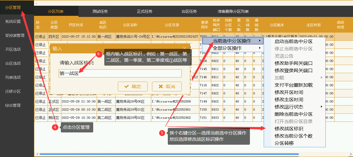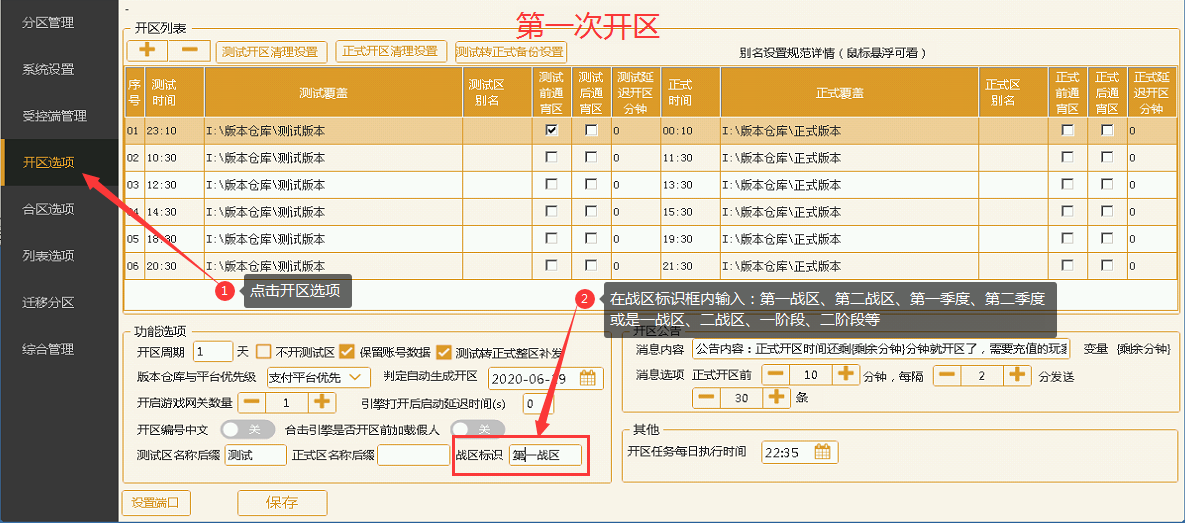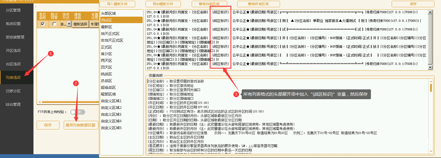 1、点击助手上的列表选项 2、再点击通用数据列表设置 3、在所有列表格式的头部展开项中加入 “{战区标识}” 变量;然后点击保存 4、点击分区管理 5、挨个右键分区—选择当前选中分区操作—修改战区标识 6、在输入框内输入战区标识文字,例:第一战区、第二战区、第一季度、第二季度或①战区等  全新开区设置方式 1、点击助手上的列表选项 2、再点击通用数据列表设置 3、在所有列表格式的头部展开项中加入 “{战区标识}” 变量;然后点击保存 4、点击开区选项 5、在战区标识的输入框内输入:第一战区、第二战区、第一季度、第二季度或①战区,一阶段、二阶段等,然后点击保存即可 说明:全新开区一段时间后要开二阶段的直接修改开区选项中的战区标识保存即可 效果展示