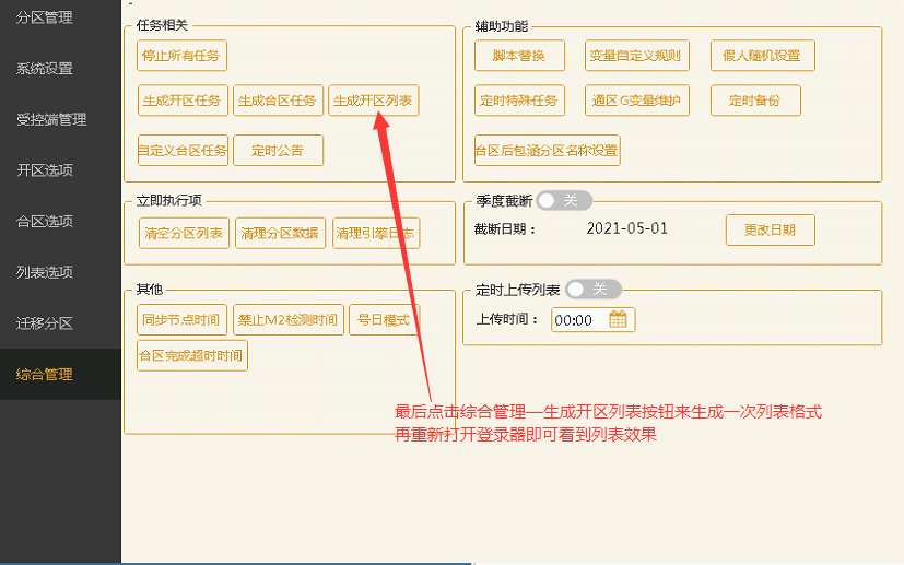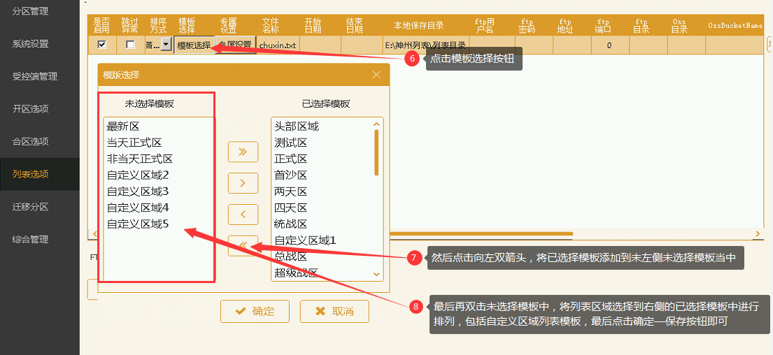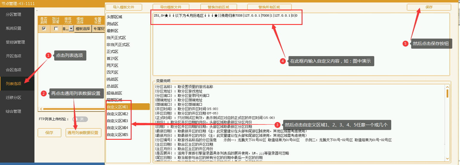 1、2、点击助手上的列表选择 3、点击自定义区域1、2、3、4、5中的任意一个 4、在列表格式框内输入自定义内容,如:图中所示(注:这里的格式需要填写完整否则会不显示) 5、然后点击保存按钮 6、点击模板选择按钮 7、点击向左方向的箭头按钮。将已选择模板选择到左侧未选择模板中 8、最后双击未选择模板中的列表区域块,将列表区域添加到已选择模板中进行顺序排列。包括添加了自定义内容的自定义区域模块,最后点击确定—并且保存即可 9、点击综合管理—生成开区列表按钮来生成一次列表格式,最后重新打开登录器即可看到列表效果 ↓↓效果展示↓↓
