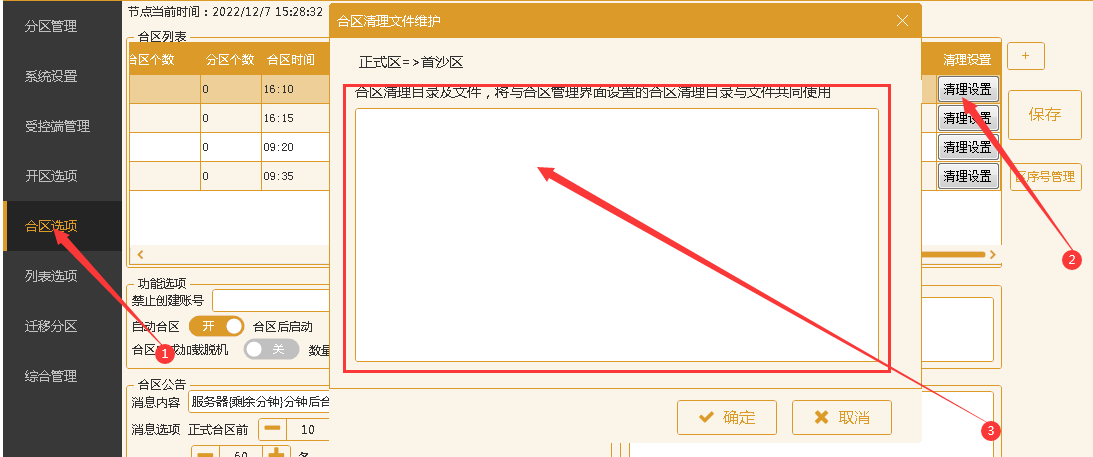 合区单独清理维护说明 合区单独维护不同种类合区模式的清理文件和清理文件夹  1、点击合区选项,合区模式中选中横拉条往后移动,就能看到清理设置按钮,点击清理设置按钮就可单独设置合区后清理的文本数据与文件夹下的数据 2、清理路径例子: Mir200\Envir\GuildBase\GuildList.txt Mir200\Envir\GuildBase\Guilds