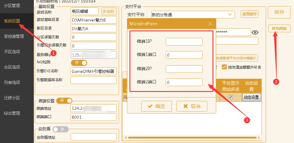 微端地址与微端端口1、2的设置  1、点击助手中的系统设置—其他微端 2、微端1IP、微端1端口、微端2IP、微端2端口 3、需要使用几个微端IP与端口,就填写几个微端地址与端口点击确定,最后点击保存即可 4、如果就使用了微端1的地址与微端1的端口,那么列表格式中使用:{微端地址1}与{微端端口1} 即可