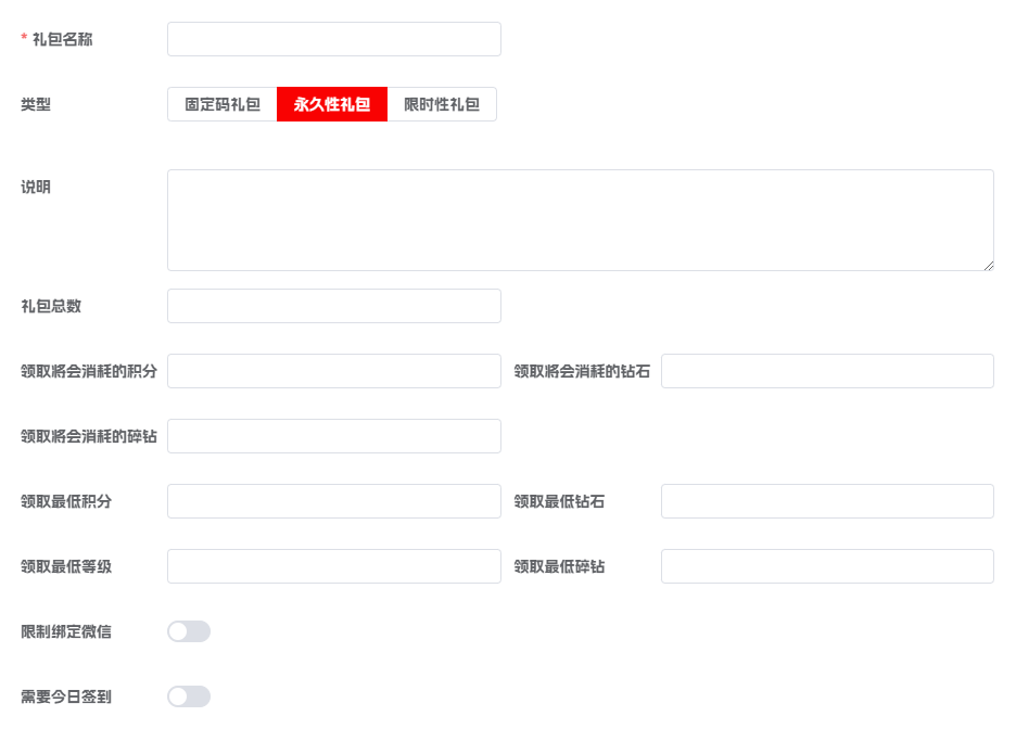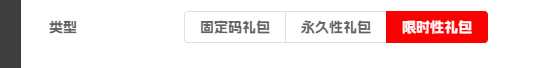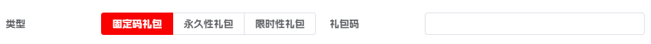 礼包 点击登录器界面右侧的礼包来添加兑换礼包 点击新增按钮设置礼包相关参数 1、礼包名称(添加该礼包的名字,比如:首次礼包、新手礼包、福利礼包等)  2、礼包类型(固定码礼包、永久礼包码、限时礼包码) 3、固定礼包码(固定礼包码代表的是只能添加一个礼包码,如果需要新的礼包码,则再重新添加一个礼包码)  4、永久性礼包码(适用于随机性礼包方式的活动,礼包码纯随机化,全系统无重复,并由数字和小写字母生成,已取掉混淆英文和数字的0和o的生成,需要永久性随机礼包码联系我们官方给你生成)  5、限时性礼包码(适用于短时间的礼包展示活动,例如抢购等,后续会开发礼包限时的倒计时展示效果 除固定礼包码以外的2种礼包码都会通过微信通给服务器进行发送统一领取兑换礼包码的存放!详细效果群里文件查看(会员站盒子与游戏服务器互通数据说明.txt))  填写相关参数后点击提交即可