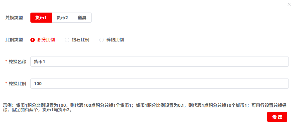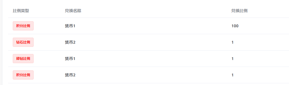 货币比例设置分别是积分、钻石、碎钻 积分1与积分2=游戏元宝、金币、金刚石、RMB点等 货币1积分比例设置为100,则代表100点积分可兑换1个货币1,货币1积分比例设置为10,则代表10积分可兑换1个货币1,(钻石、碎钻设置相同) 注:必须要先设置此处的兑换比例,否则将无法兑换游戏货币